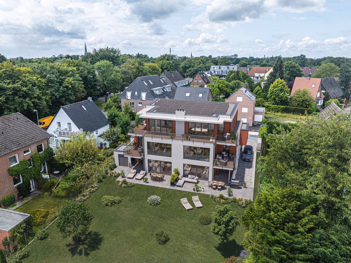 Jede der fünf Wohnungen besticht durch eine luxuriöse Ausstattung, großzügige Grundrisse und sonnenverwöhnte, lichtdurchflutete Räume, die eine unvergleichliche Wohlfühlatmosphäre erzeugen. Die Erdgeschosswohnungen verfügen über private Gärten und Gartengerätehäuser, die viel Raum für individuelle Gestaltungsmöglichkeiten bieten. In den oberen Etagen erweitern große Terrassen und Balkone den Wohnraum ins Freie und bieten einen herrlichen Blick ins Grüne.